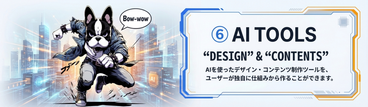 AI TOOLSの一つ、バナー制作に必要なデザイン要件や文字情報をもとに、AIでバナーを生成するエレメントです。 トーン、被写体の表現、レイアウトの意図などを整理・登録することで、 告知やプロモーションなど、目的に合わせたバナー制作が行えます。 その他の AI TOOLS は、以下のバナーからご覧ください。